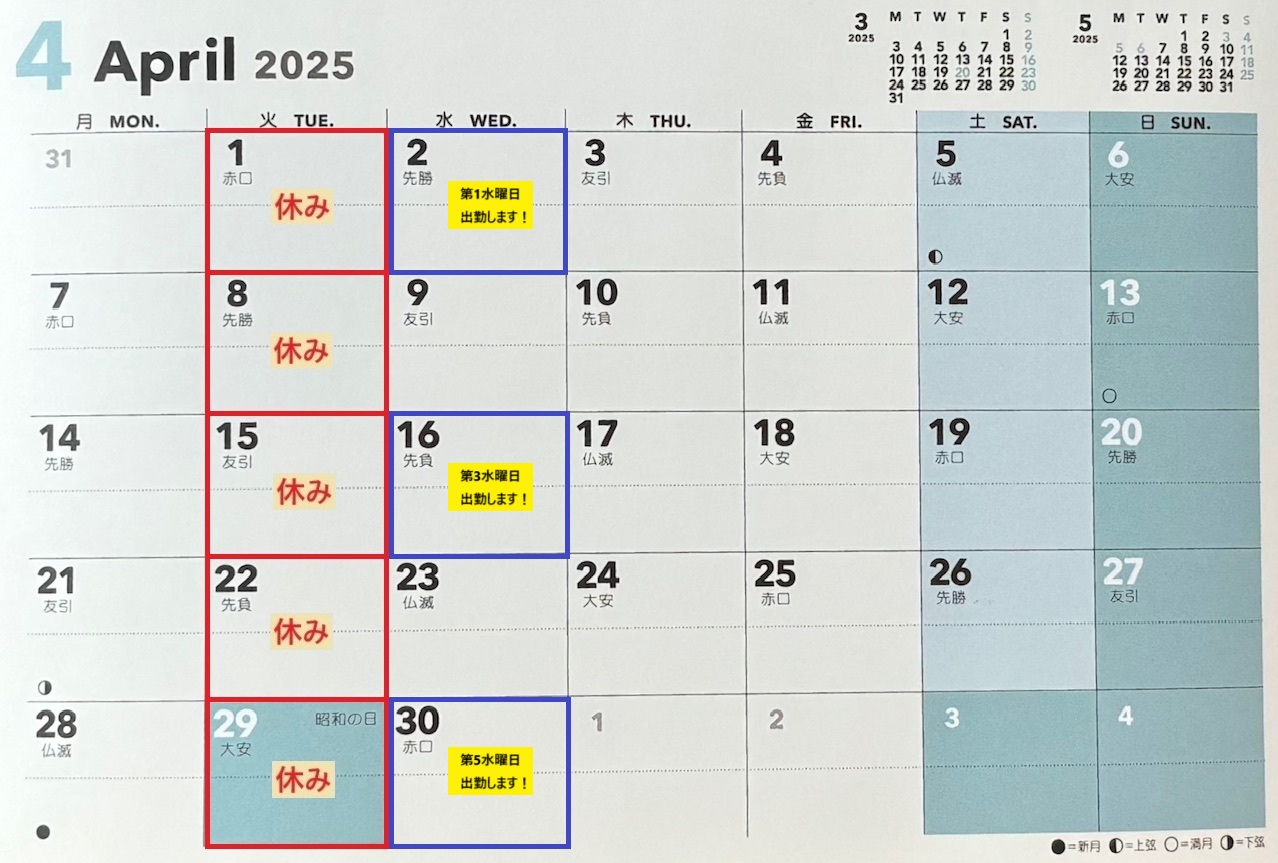 4月の営業日です📅 2/(水)・3/16(水)の第1・3水曜日は営業します😆😆 […]