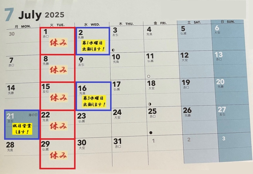7月の営業日です📅 7/2(水)・7/16(水)の第1・3水曜日は営業します😆😆 […]