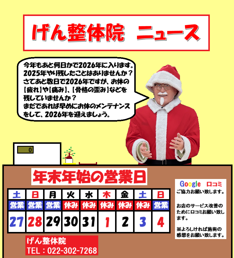 『げん整体院ニュース』です👍✨ 12月も後半に入り日中もだいぶ冷える日が増えてき […]