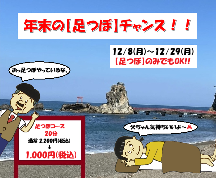 12/8(水)〜12/29(月)まで【足つぼ 20分】 通常2,200円(税込) […]