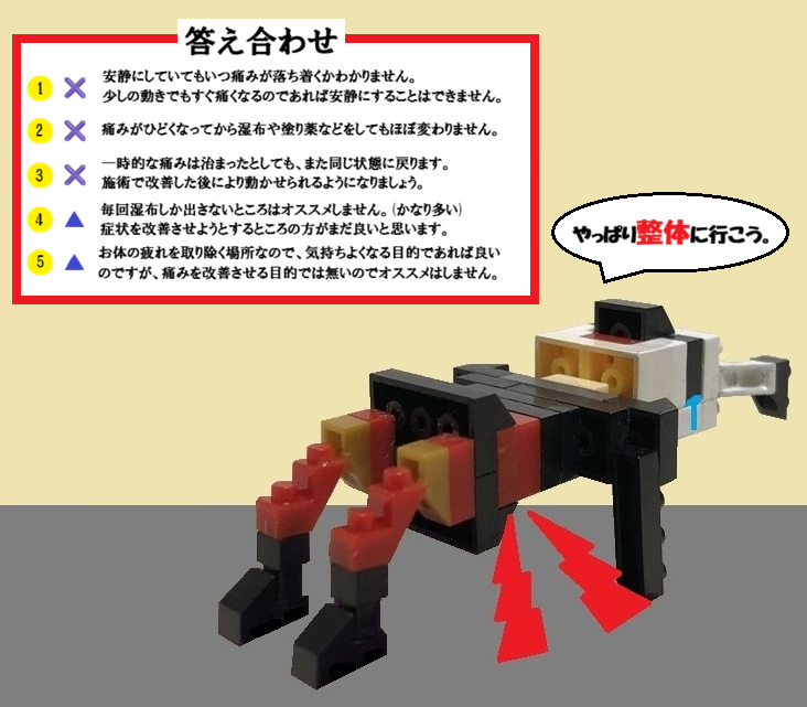 そして病院や整形外科では結果湿布をもらいに行くだけのために長く待たされて何の解決にもならない。(これは来られた患者さんの答えでもあり私も同じ答えです)