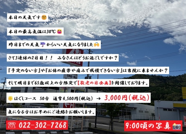 9/10(水)〜9/15(月)まで【敬老の日 企画】で施術がお得になります✋
