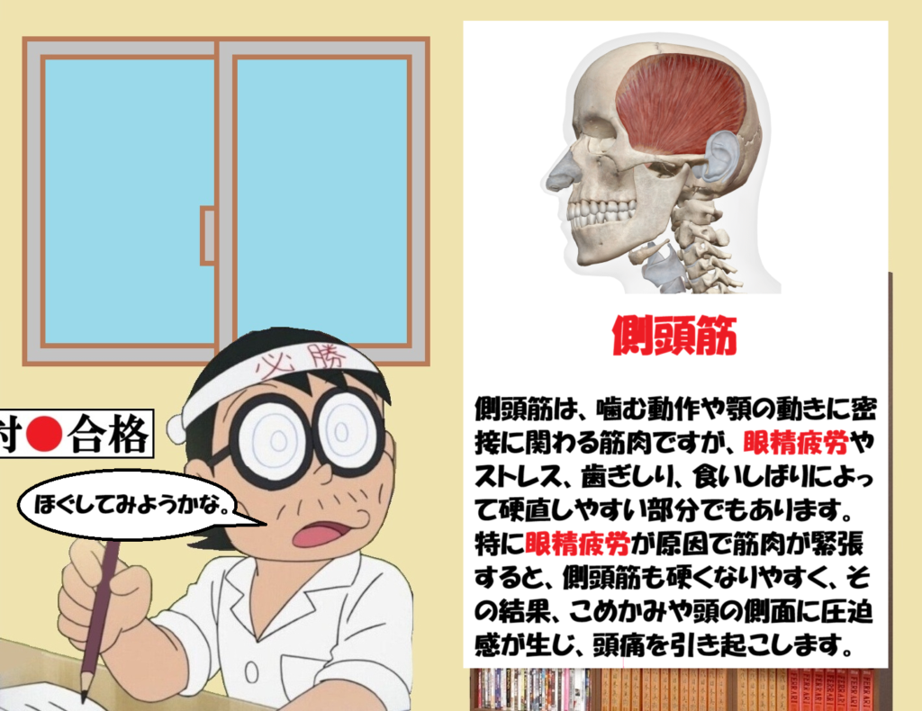 【後頭下筋群】と同時に【側頭筋】も硬くなっている場合があります。