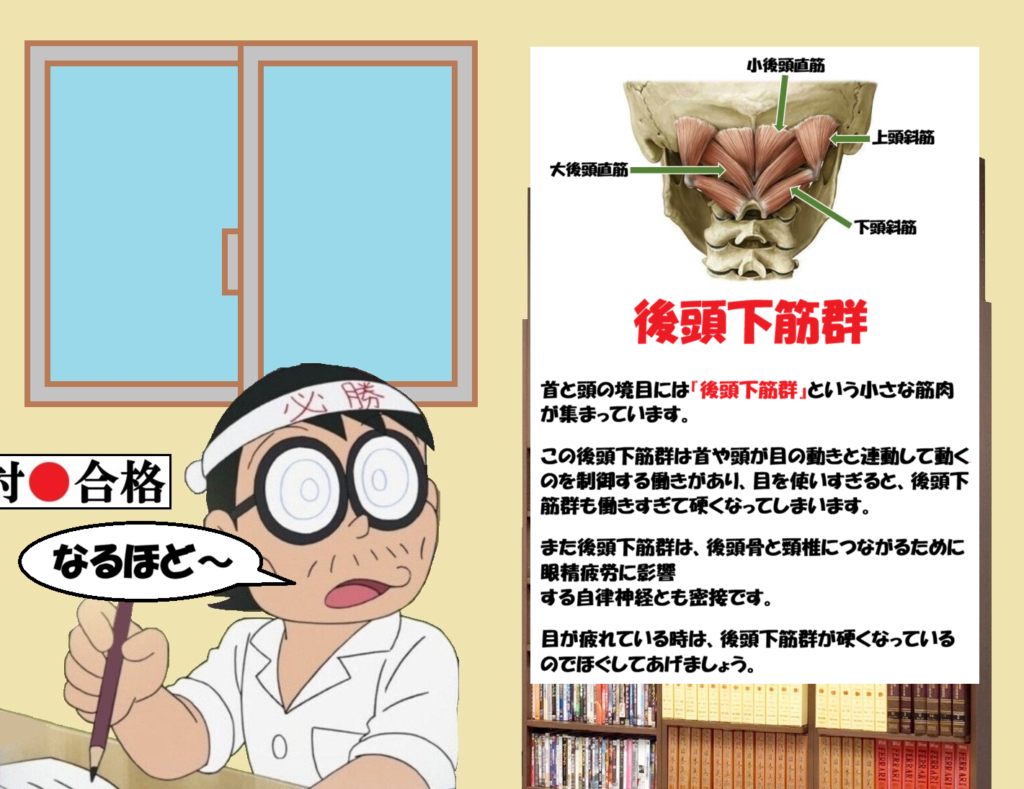 この【後頭下筋群】は、首や頭が目の動きと連動して動くのを制御する働きがあります。