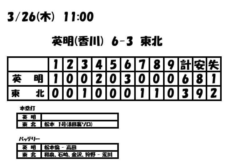 第98回選抜高校野球大会の8日目2回戦 東北 vs 英明(香川)は3-6で東北は敗退しました😢😢