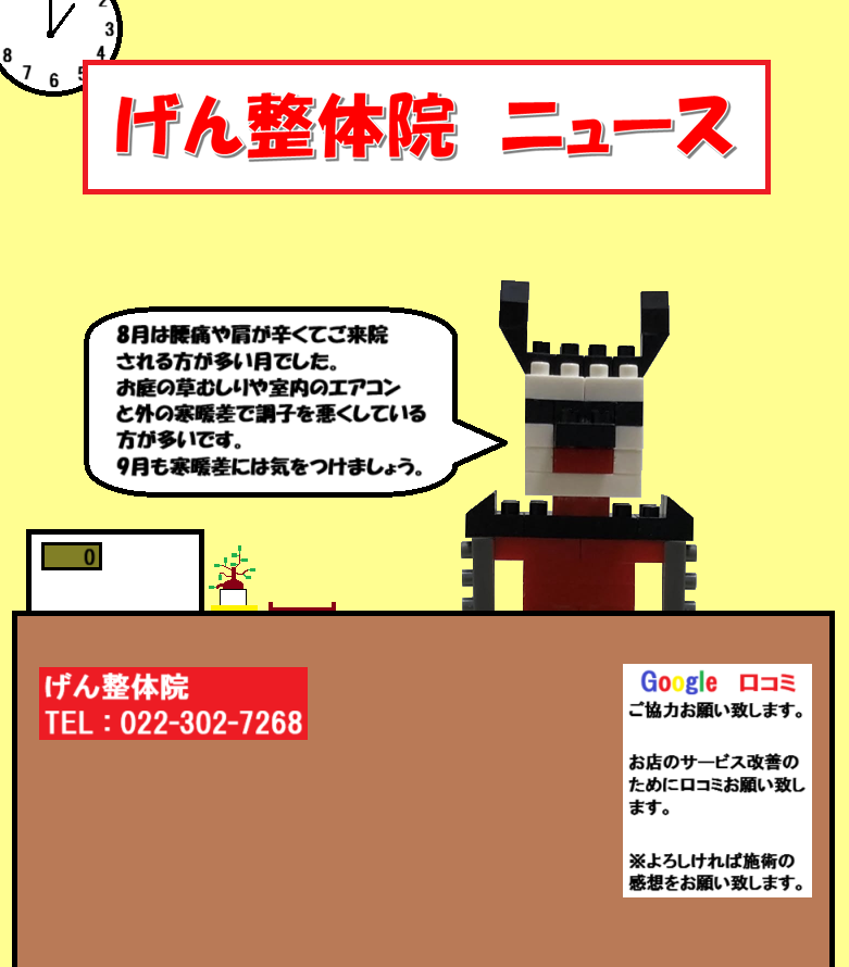 今月は中旬にお盆休み(最大9連休)がありましたが、来て頂いたお客様では腰痛が特に多かったです。