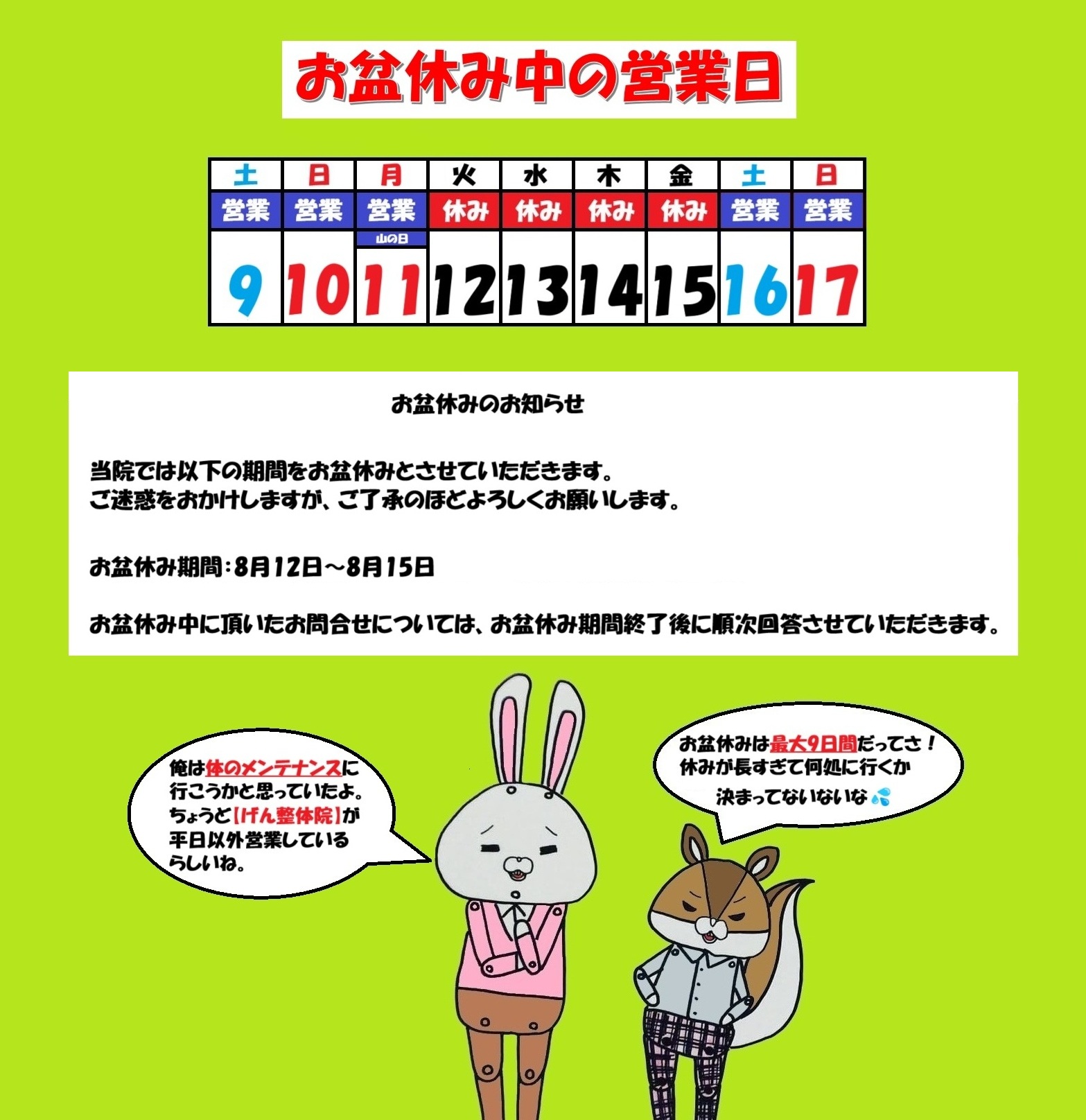 今年のお盆休みは最大9日間!! 当院では8/12(火)〜8/15(金)まで【4日 […]