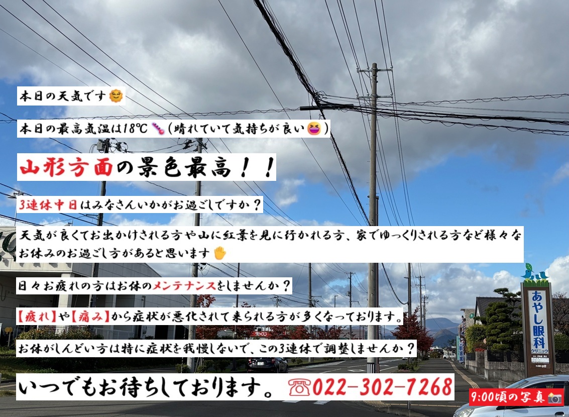 本日の天気です🌞 本日の最高気温が18℃ (天気が良く暖かいっ😀) そして3連休 […]